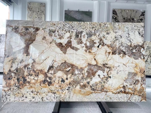 Pandora Granite is a beautiful and unique natural stone that is quarried in Brazil. It is a coarse-grained granite with a predominantly creamy white background, highlighted by striking patches of gold, brown, and cream-colored veins.